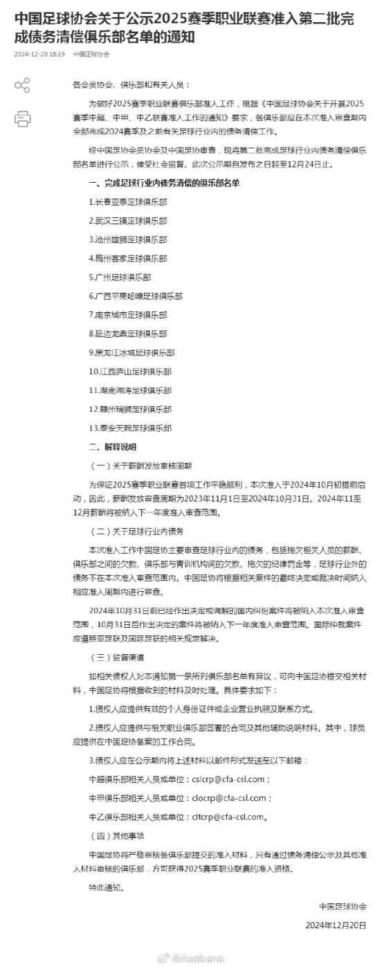 中國足協(xié)公示2025賽季職業(yè)聯(lián)賽準入第二批完成債務清償俱樂部名單,此前不在第一批名單里的長春亞泰、武漢三鎮(zhèn)、滄州雄獅、梅州客家、廣州、廣西平果哈嘹、南京城市、延邊龍鼎、黑龍江冰城、江西廬山、湖南湘濤、贛州瑞獅、泰安天貺全員上榜,相當于所有三級職業(yè)俱樂部都進行了完成債務清償?shù)墓尽????
